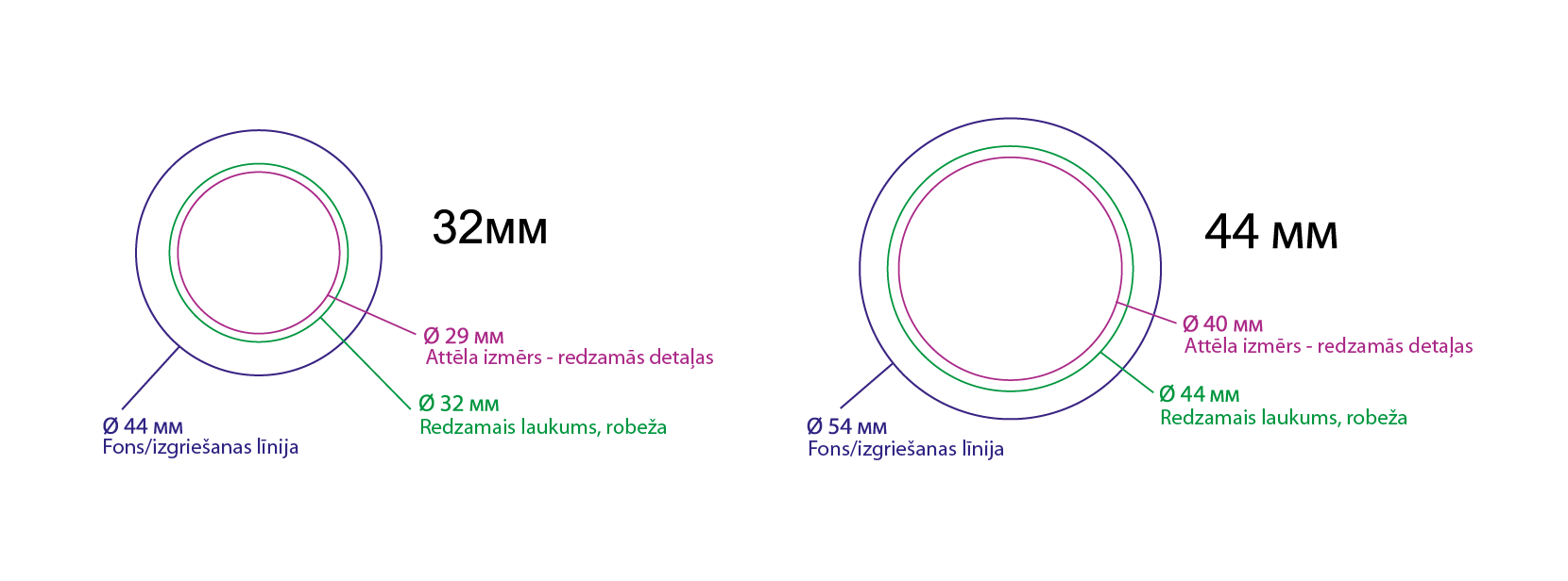 Nozīmītēm piedāvājam divus populārus izmērus – 32 mm un 44 mm diametrā. Tās ir apaļas, izgatavotas no metāla ar plastikāta apvalku, un piestiprināšanai tiek izmantota droša adatiņa. Šāda konstrukcija nodrošina izturību, ērtu lietošanu un vizuālu pievilcību, padarot nozīmītes par lielisku aksesuāru vai atgādinājumu par pasākumu.